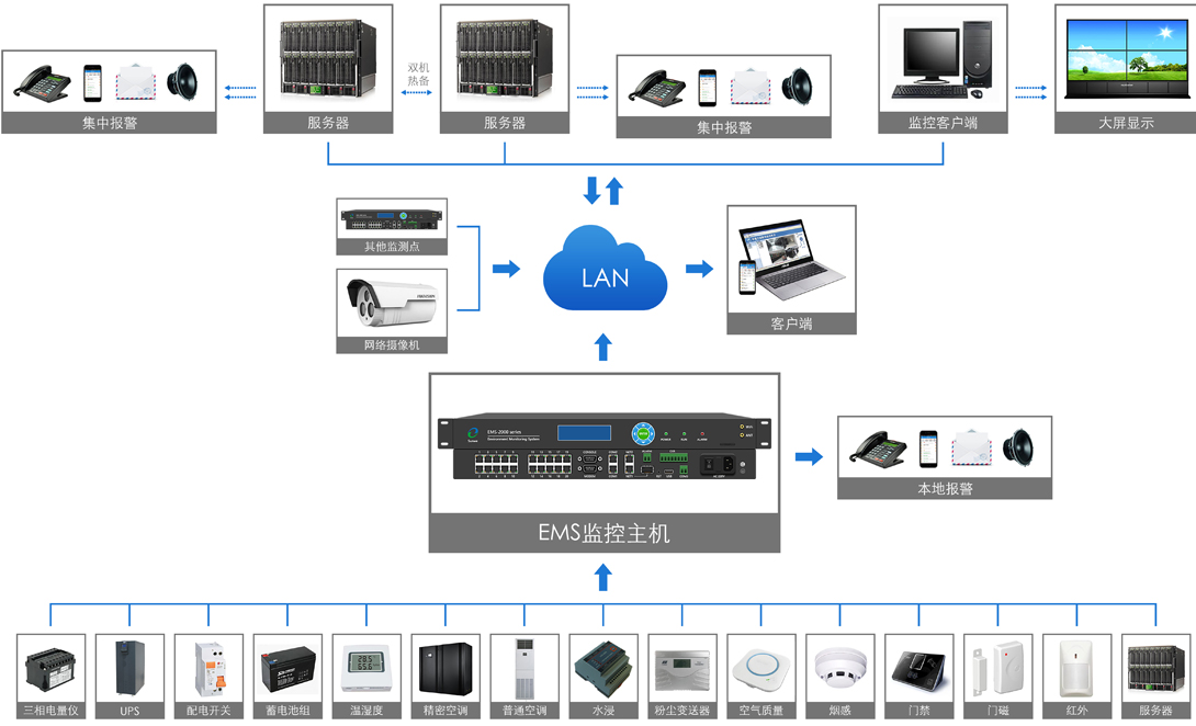 EMS系列監(jiān)控主機主要用以采集數(shù)據(jù)、處理數(shù)據(jù),可對環(huán)境、運行負(fù)載、設(shè)備溫升、局放工況、安防、視頻、消防、智能設(shè) 備等進(jìn)行一體化監(jiān)控。在實際應(yīng)用中,與不同類型的傳感器相連,布線簡潔,操作方便。